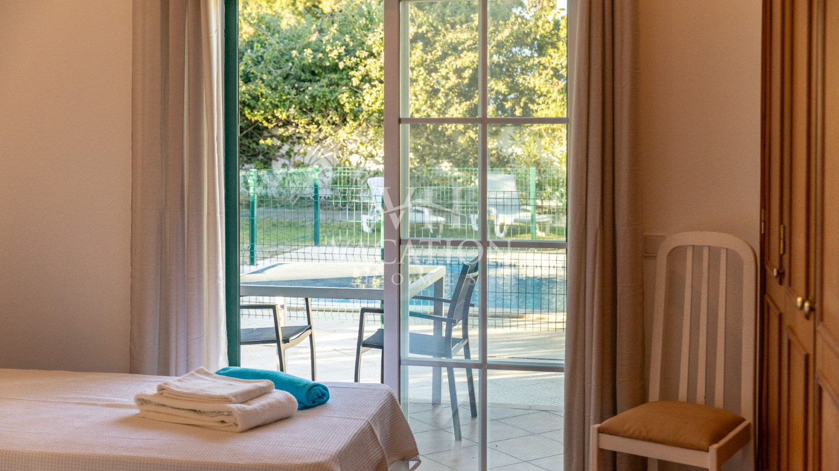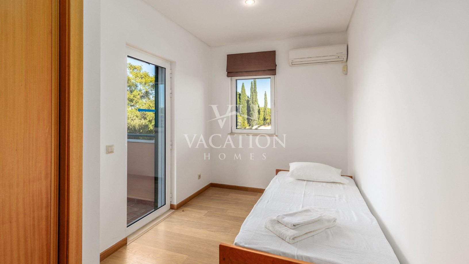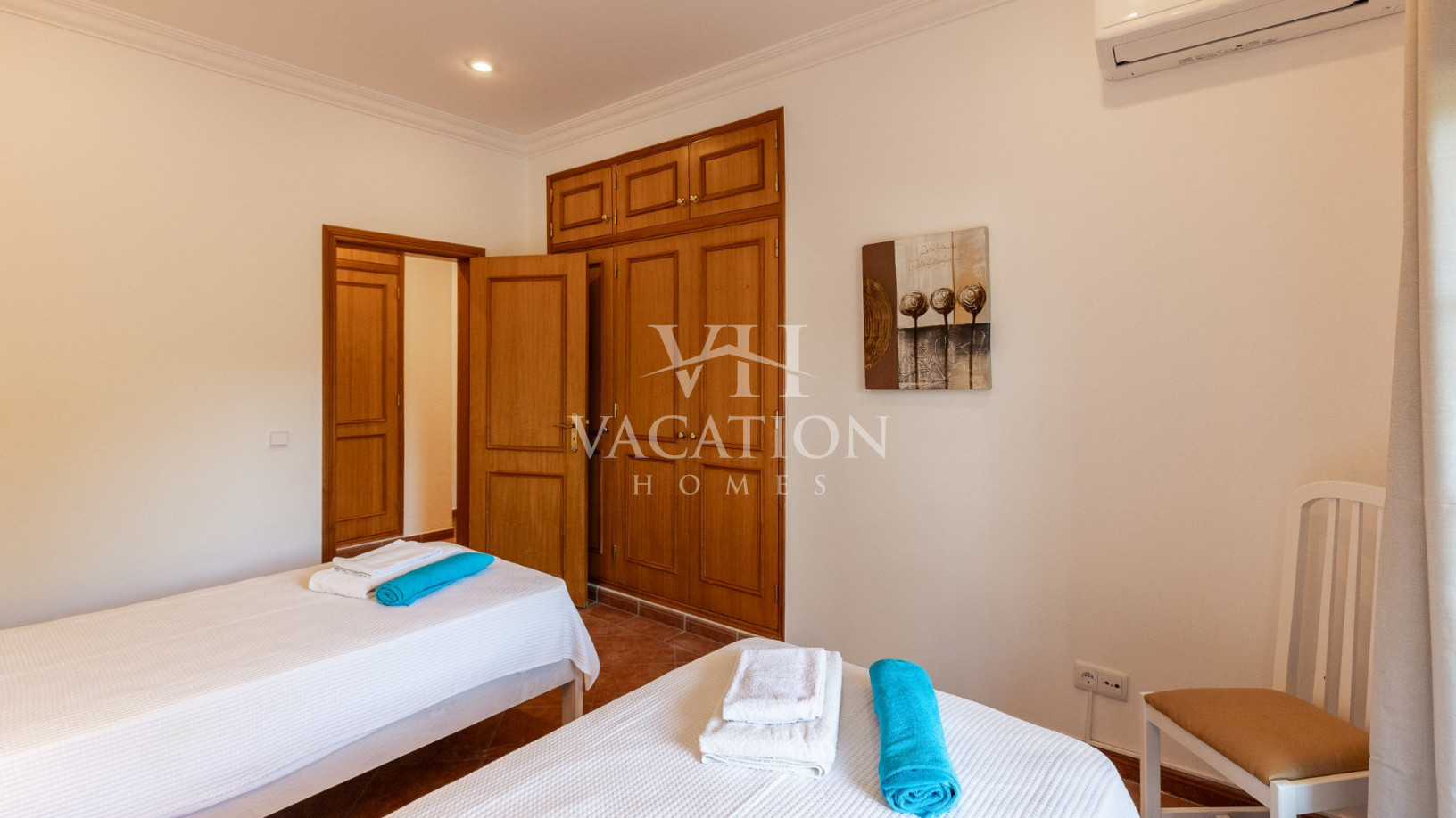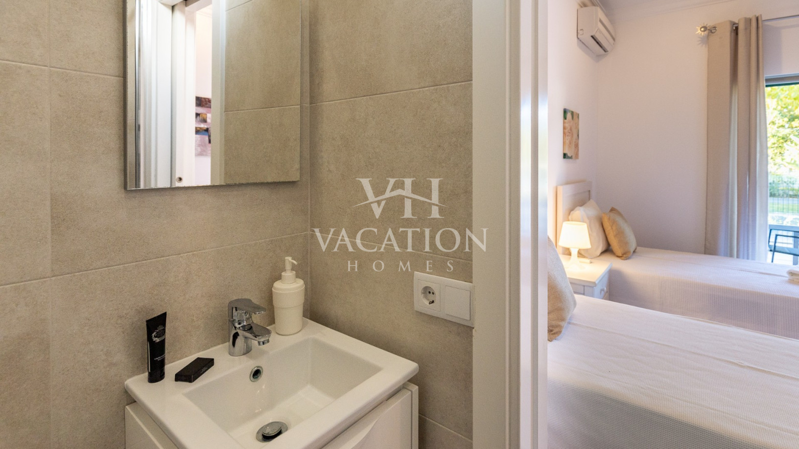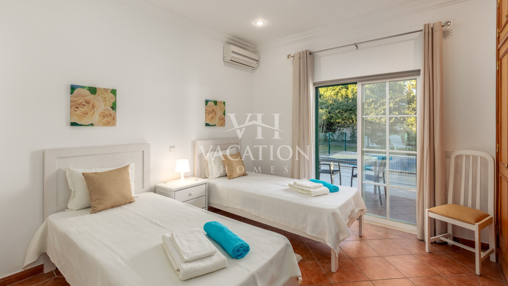 - Bedroom 1: two single beds, bedroom that uses bathroom 1, A/C unit, with access to the pool terrace through a sliding door.