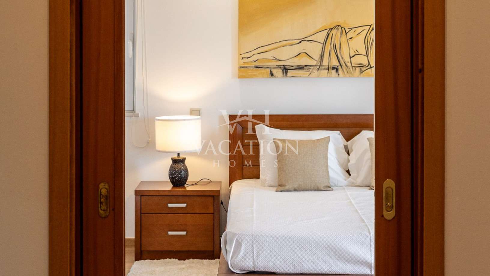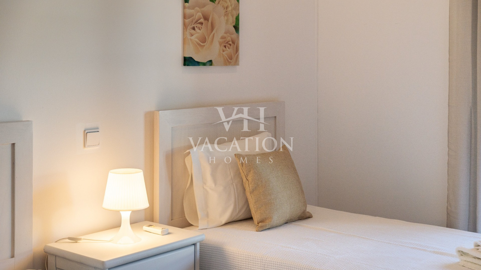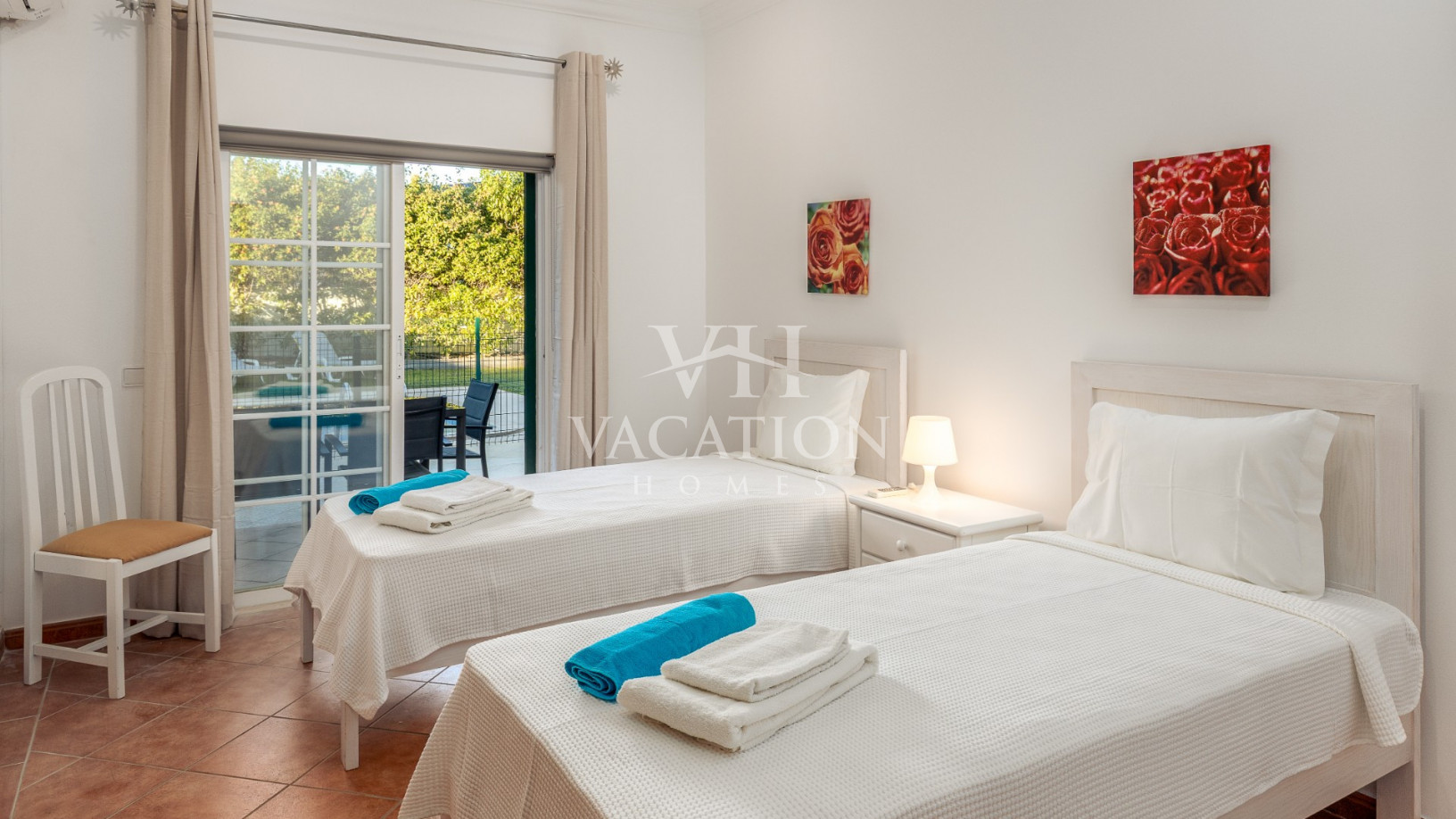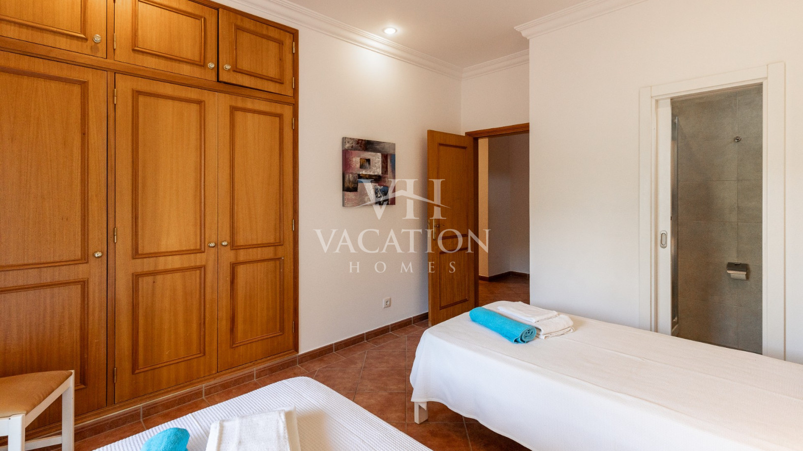 - Bedroom 1: two single beds, bedroom that uses bathroom 1, A/C unit, with access to the pool terrace through a sliding door.