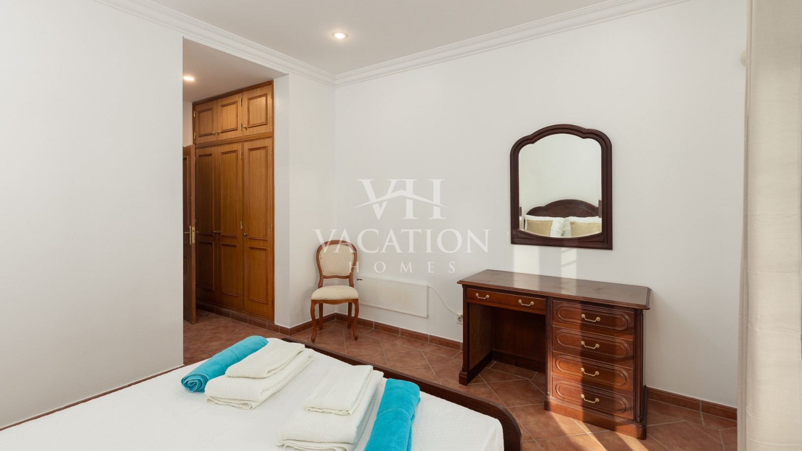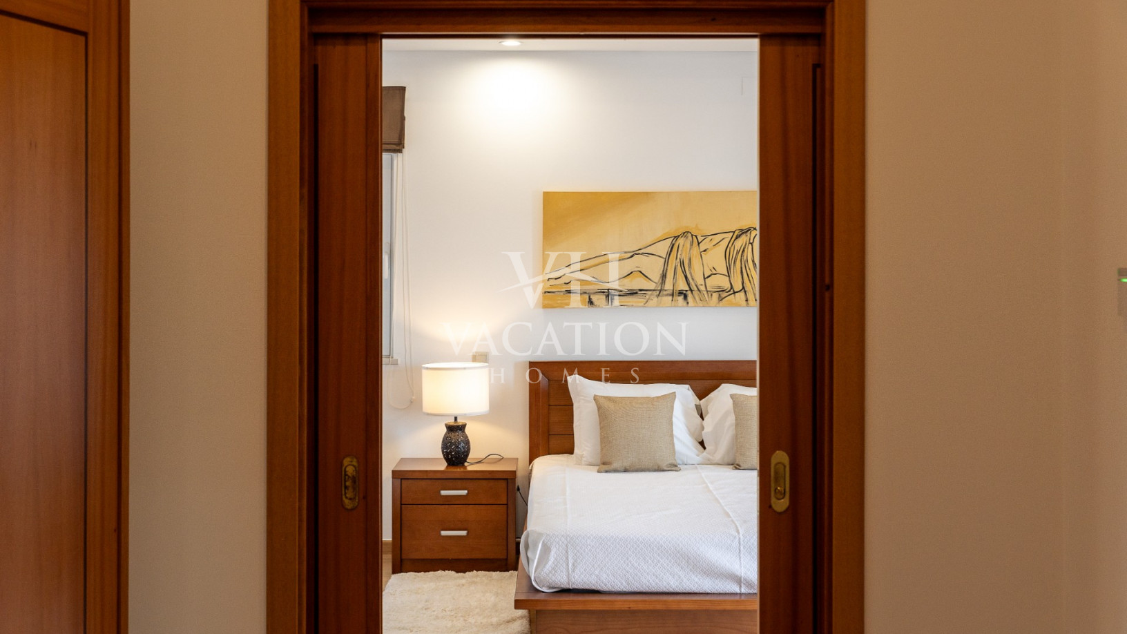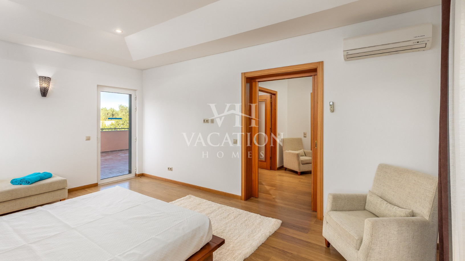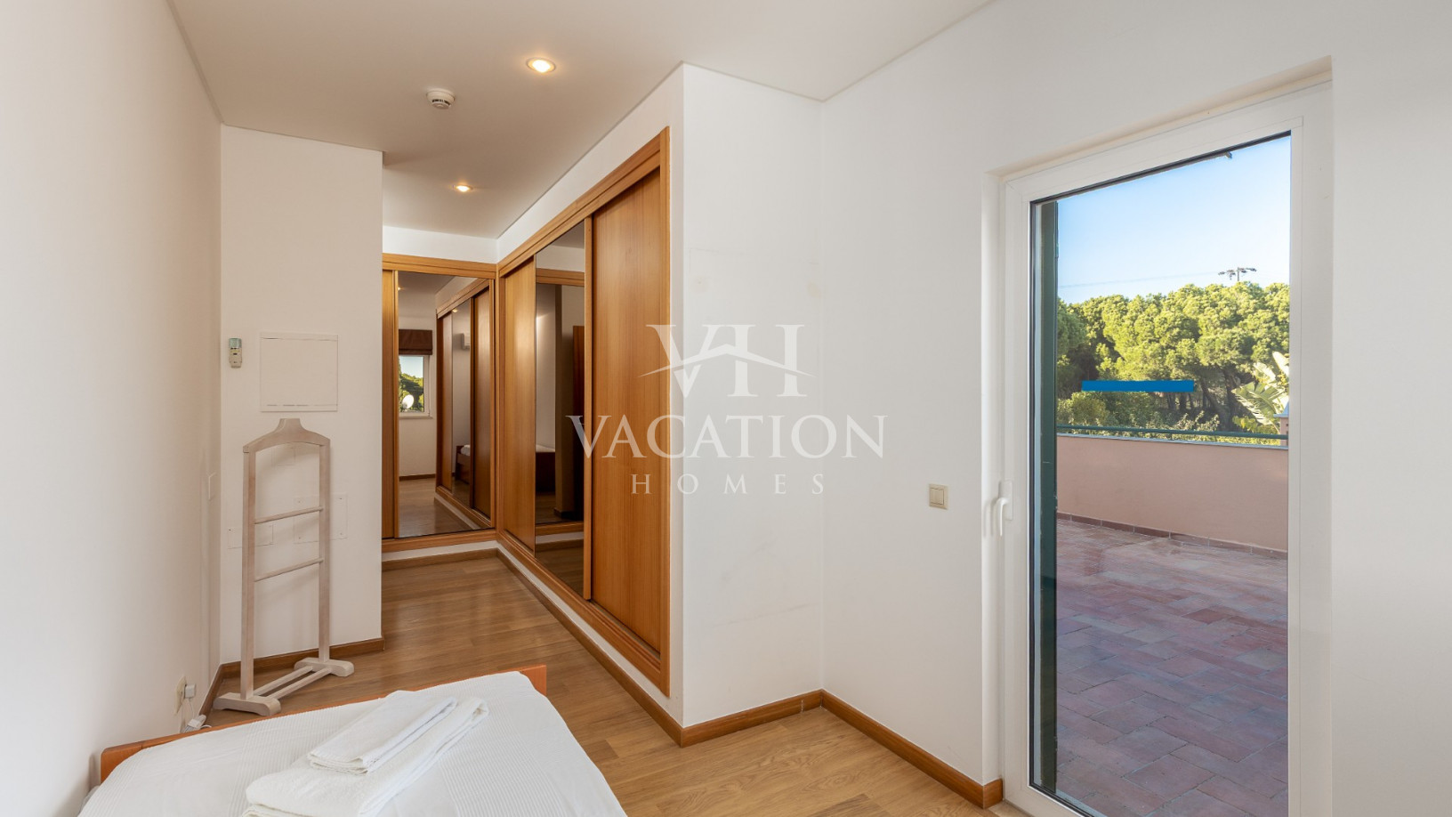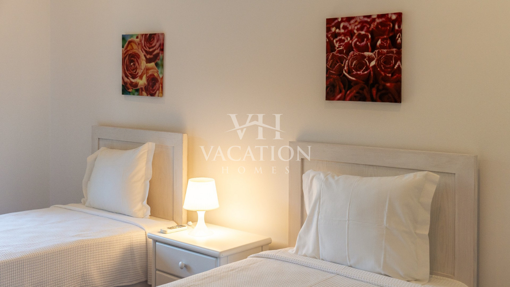 - Bedroom 1: two single beds, bedroom that uses bathroom 1, A/C unit, with access to the pool terrace through a sliding door.