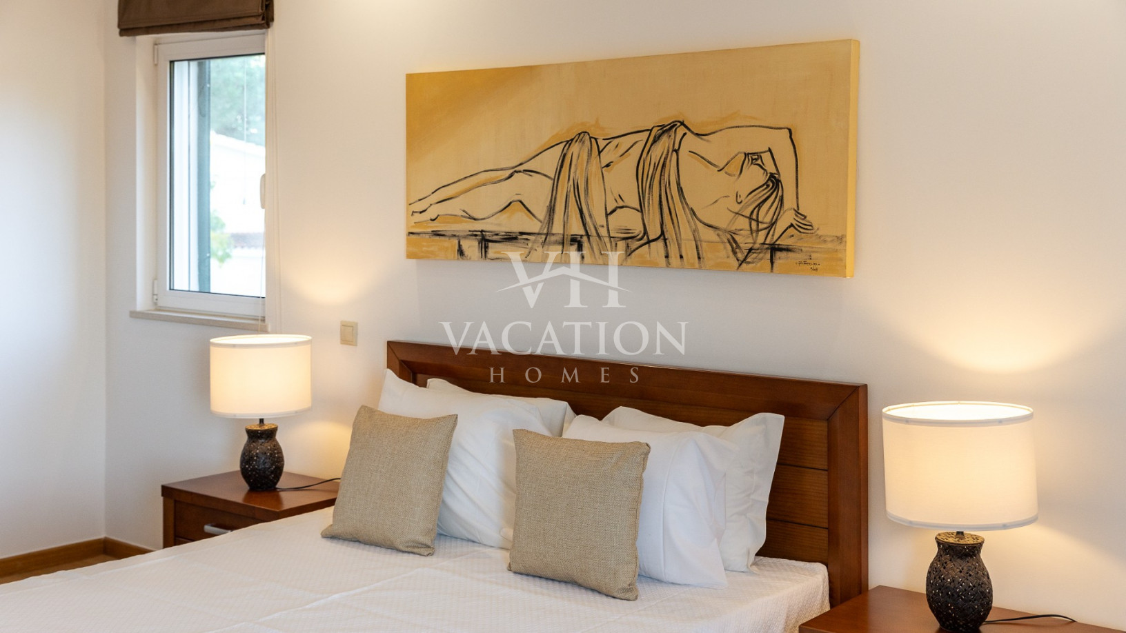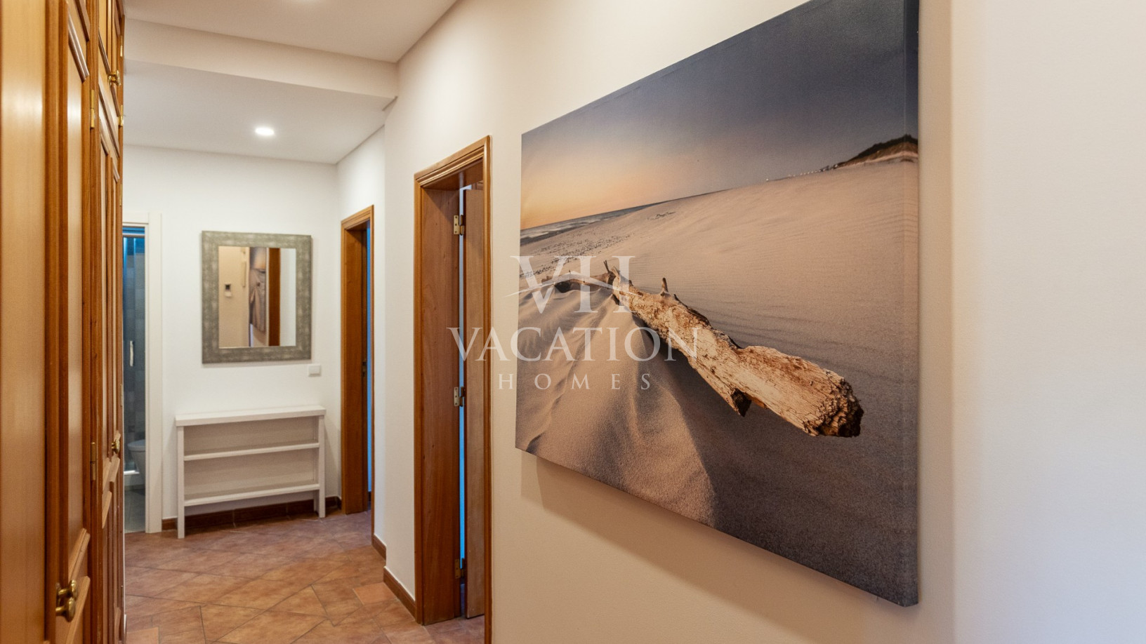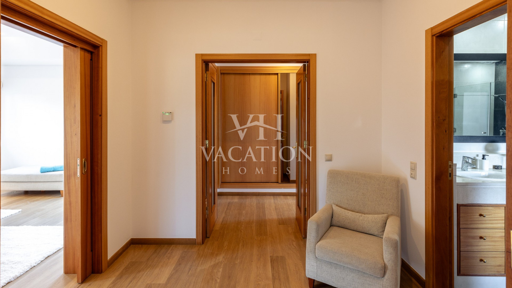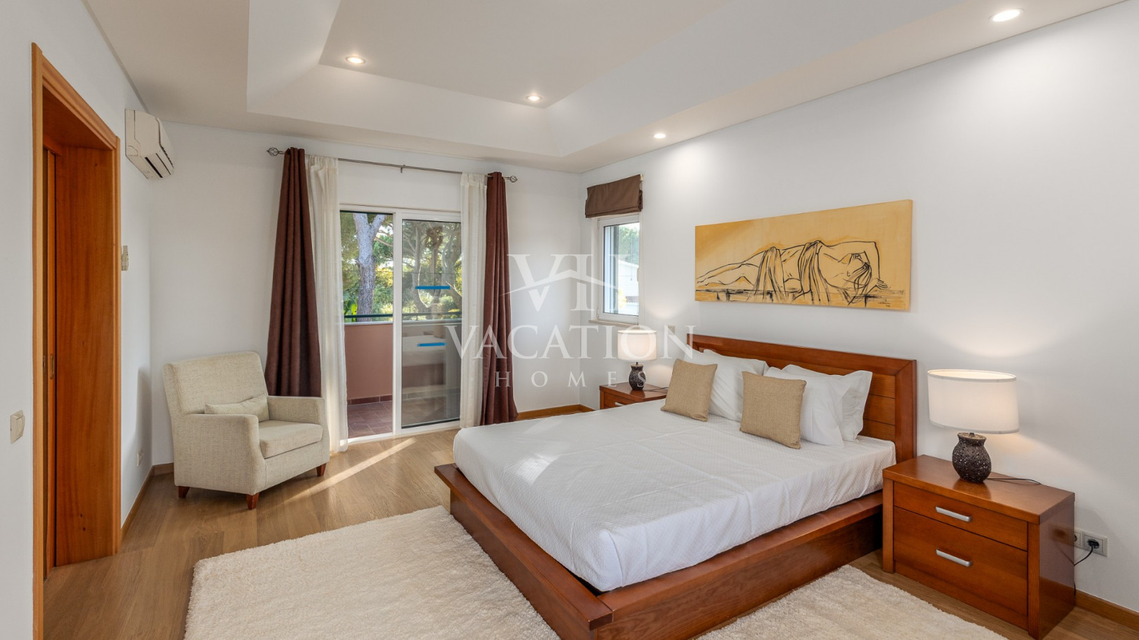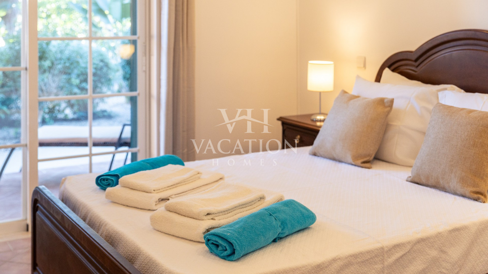 - Bedroom 1: two single beds, bedroom that uses bathroom 1, A/C unit, with access to the pool terrace through a sliding door.