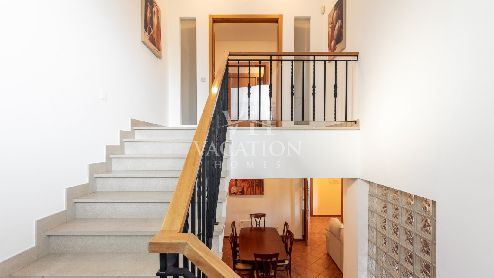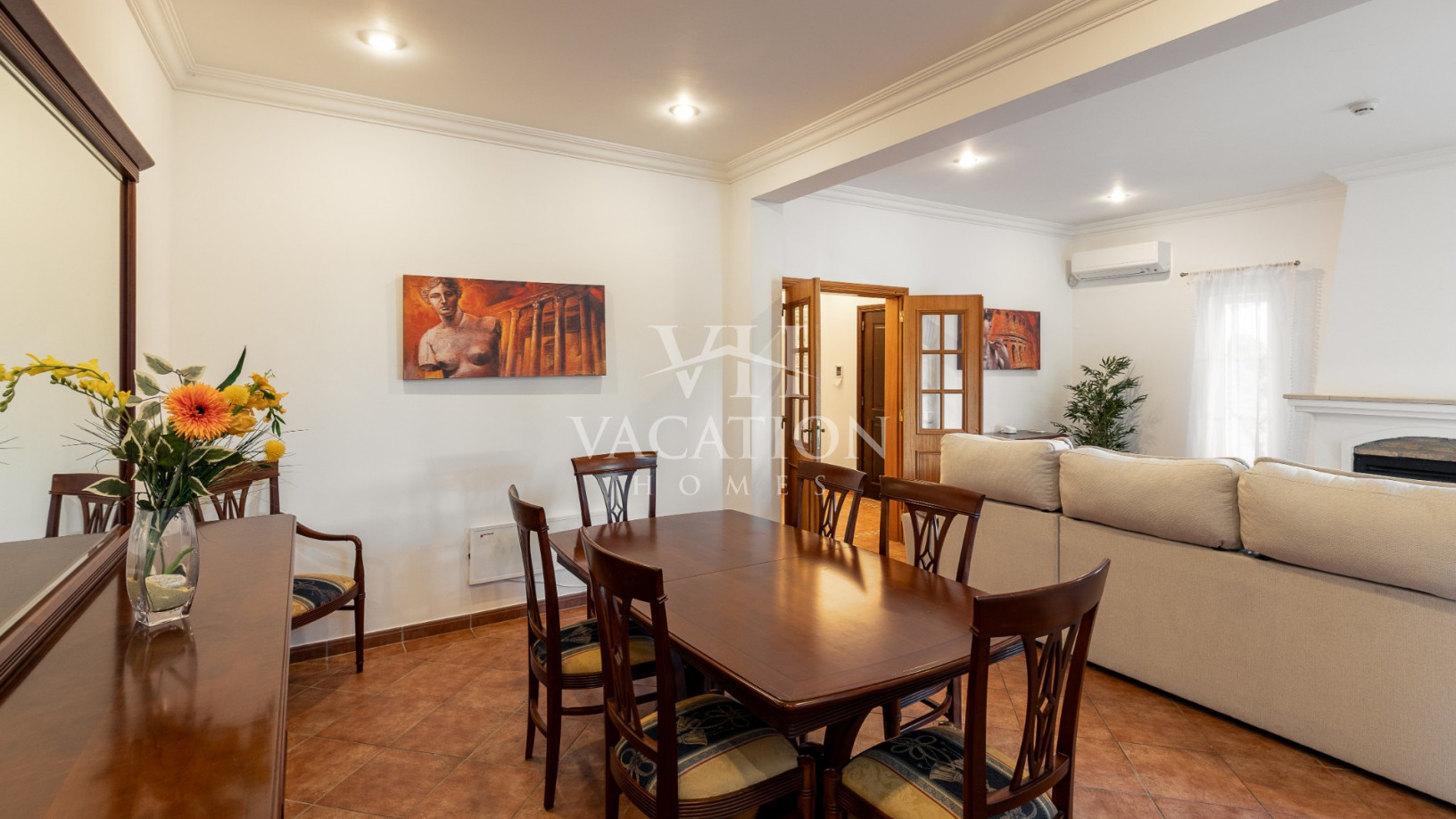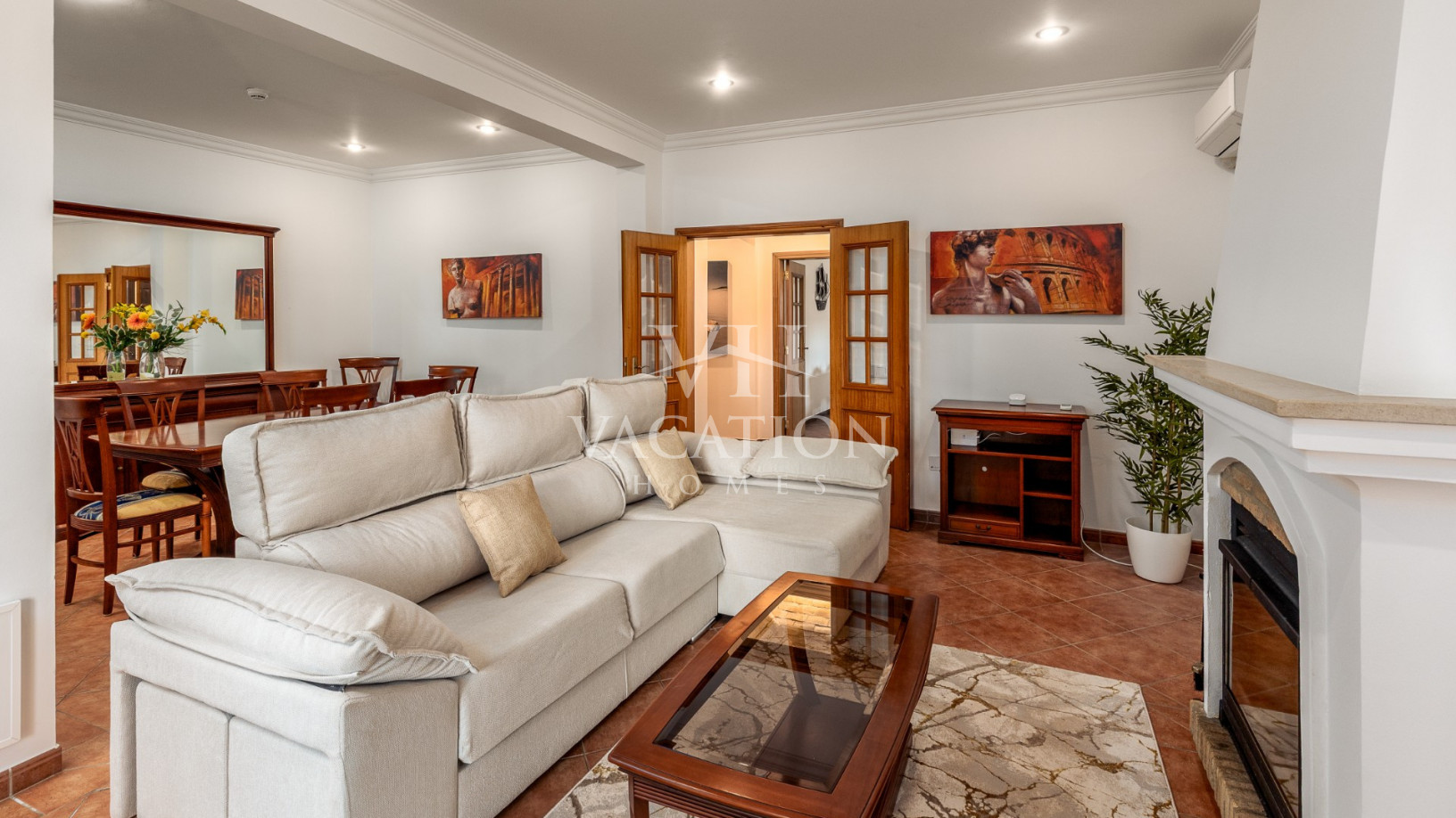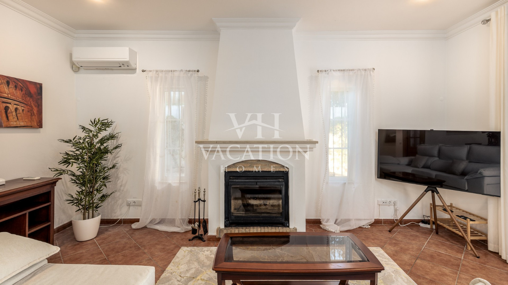 The accommodation includes an open-plan living room with a closed fireplace, air conditioning and TV (smart TV), dining area with access to the front of the house.