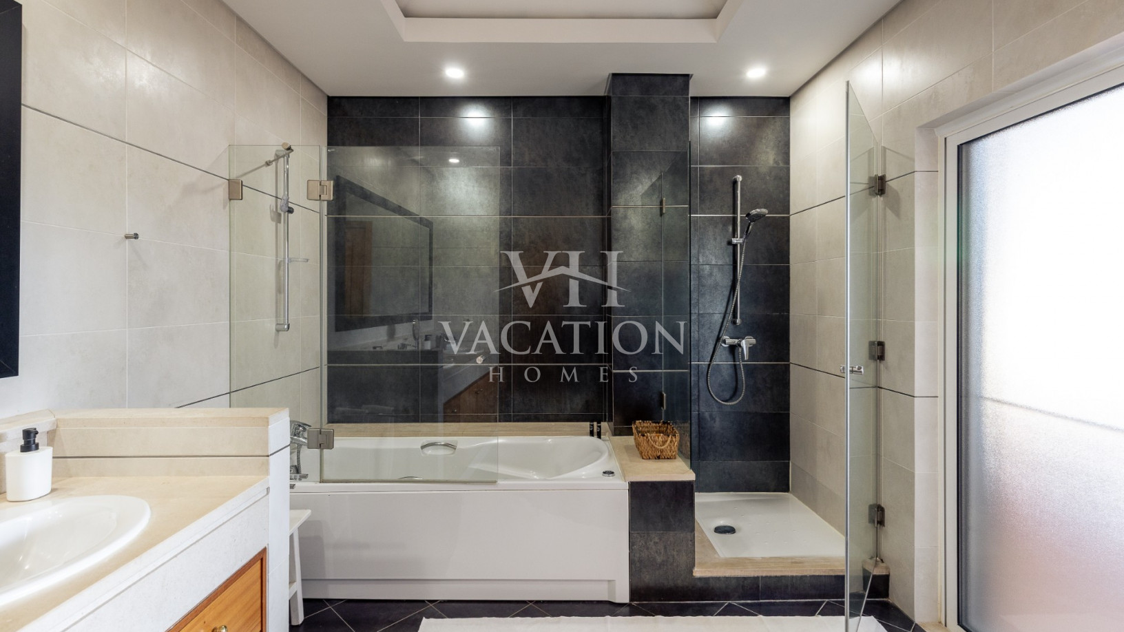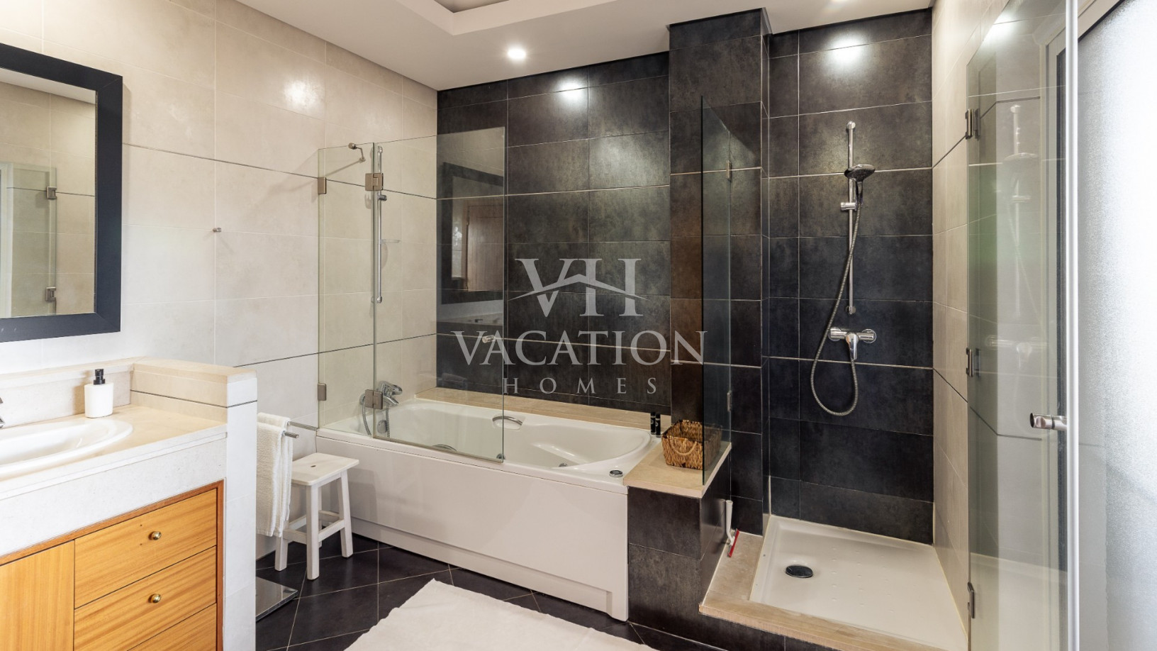 First floor: 4th bedroom, large master bedroom, with double bed (160cm), A/C unit, two terraces (front and pool), spacious dressing area with bed area with a single bed with drawer bed (bunk bed), A/C and terrace facing the pool. Private bathroom with double sinks, shower and massage bath with window to the front of the house.