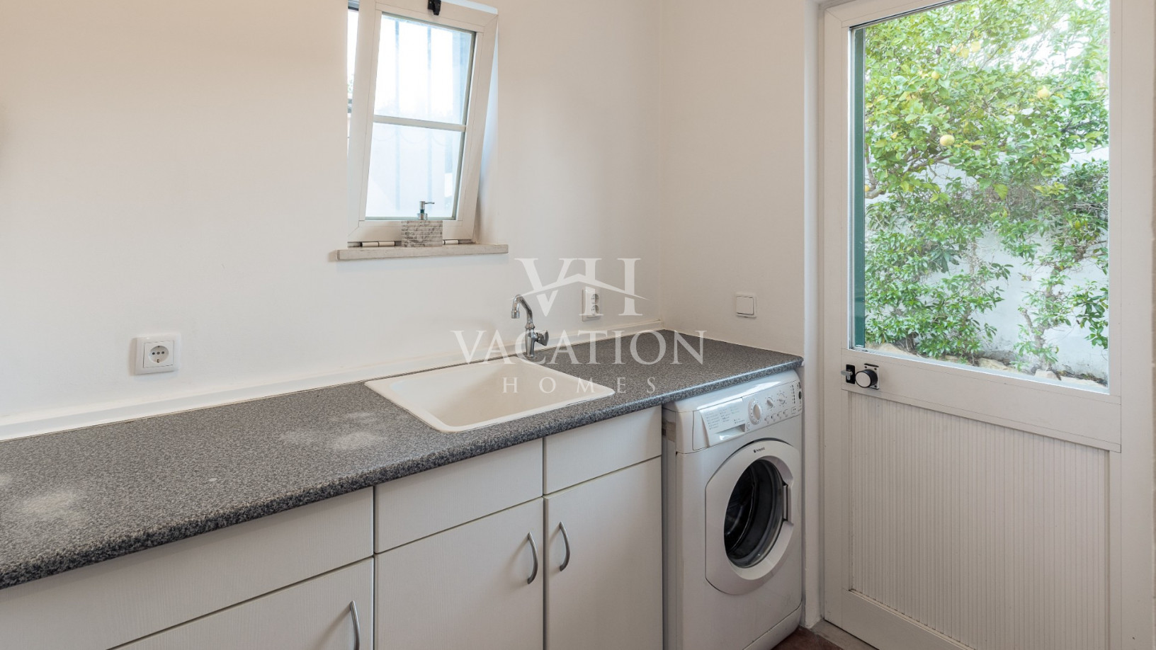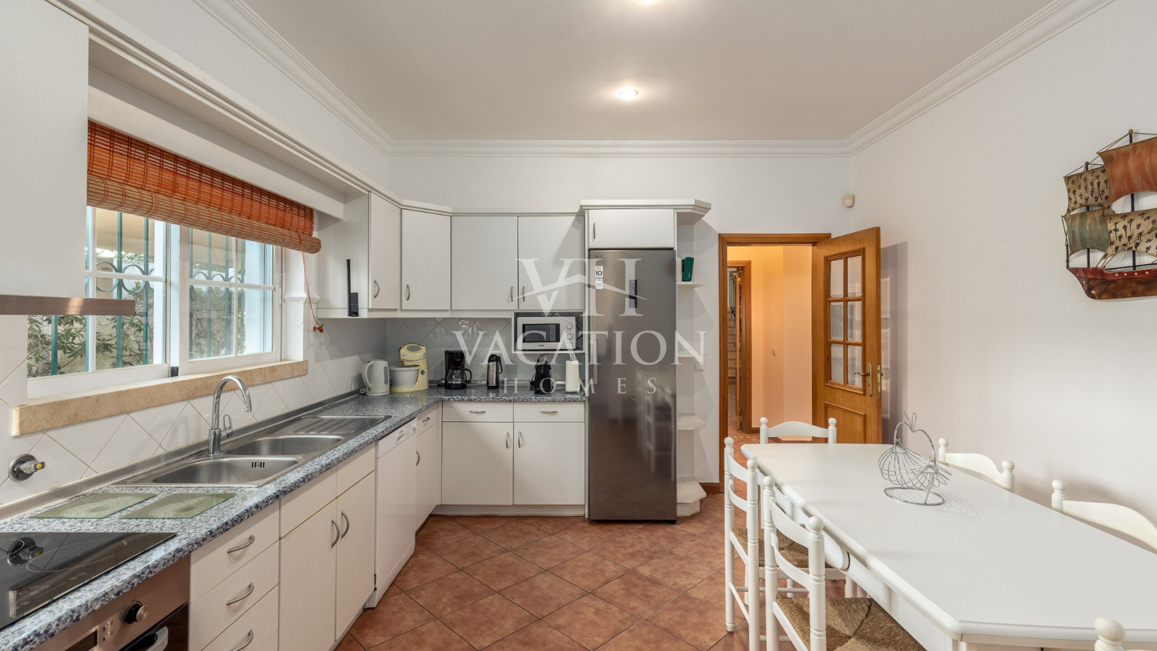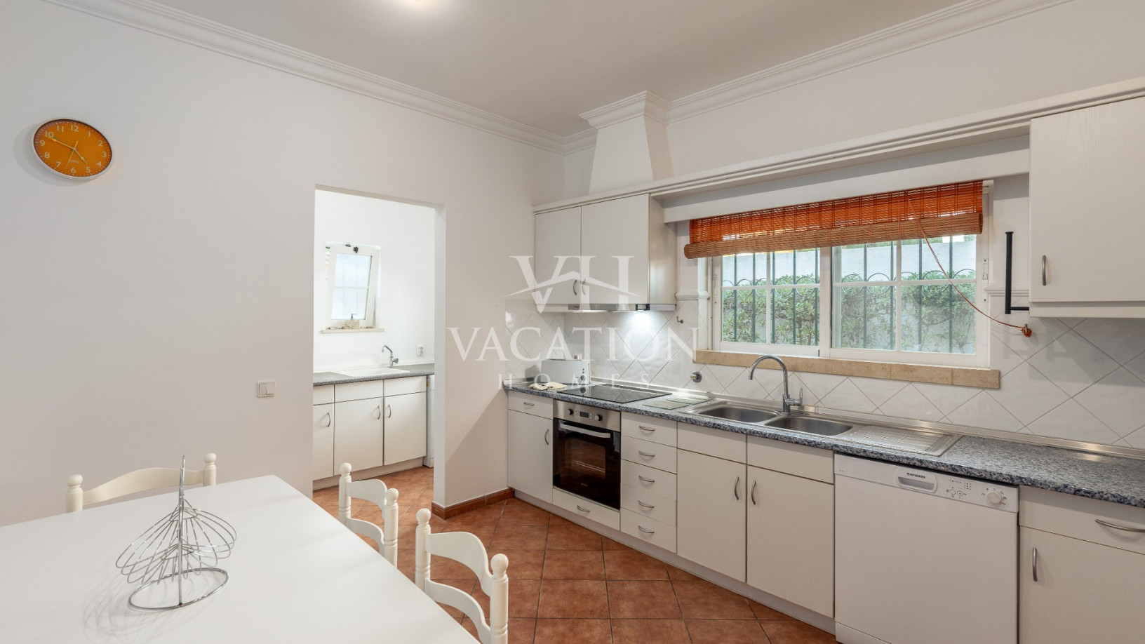 Opposite the living room is the fully equipped kitchen (electric stove, oven, microwave, dishwasher, fridge/freezer), with a breakfast area (table and chairs) with access to the laundry room (washing machine and another combined fridge) and with access to the outdoor terrace, the pool and the garden.